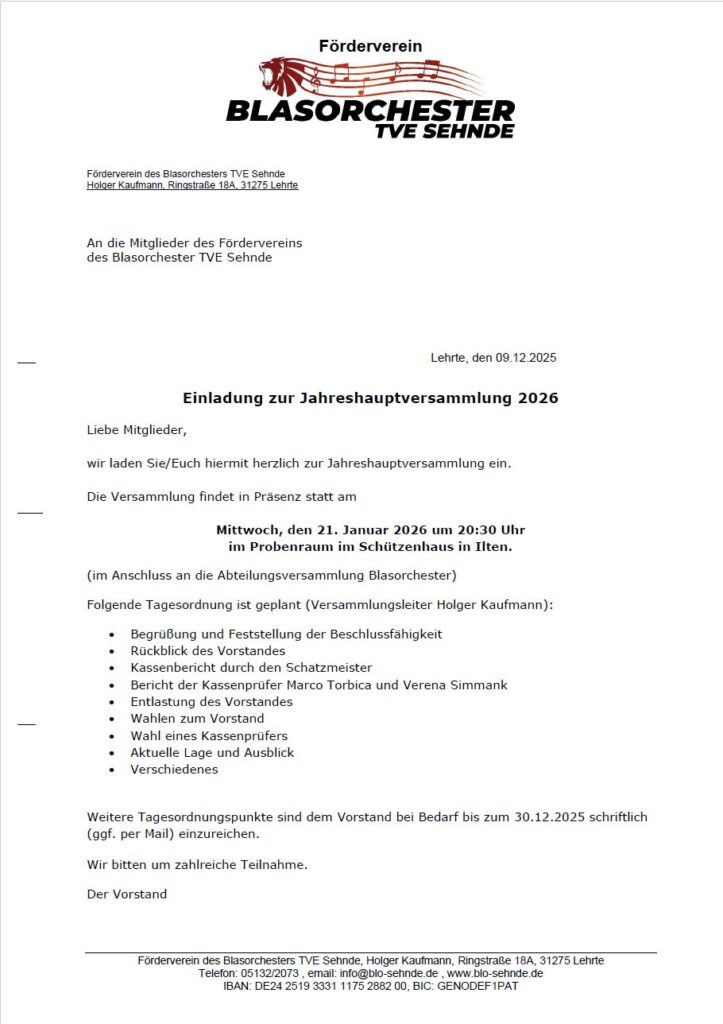 Einladung zur Hauptversammlung des Fördervereins Blasorchester